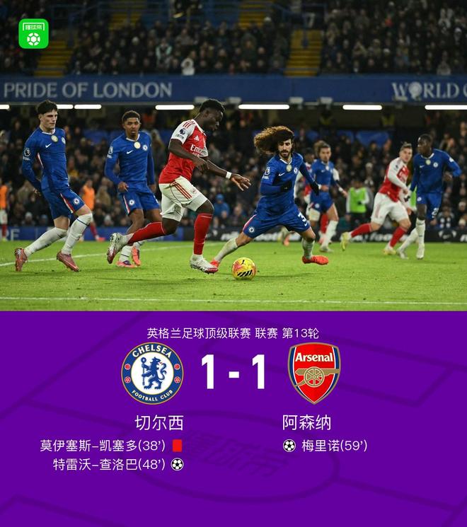 2025年12月01日 十人切尔西1-1阿森纳 凯塞多直红查洛巴梅里诺破门 枪手5分领跑