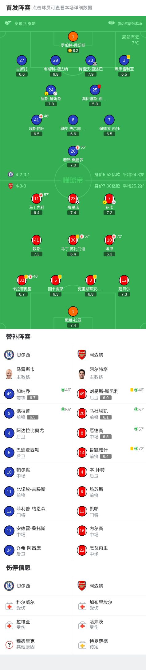北京时间12月1日英格兰足球顶级联赛第13轮,切尔西主场对阵阿森纳。上半场,凯塞多踩踏梅里诺吃到第二张黄牌被罚下。下半场特雷沃-查洛巴破门,切尔西取得领先。随后阿森纳由梅里诺头球扳平。最终比分切尔西 1-1 阿森纳。