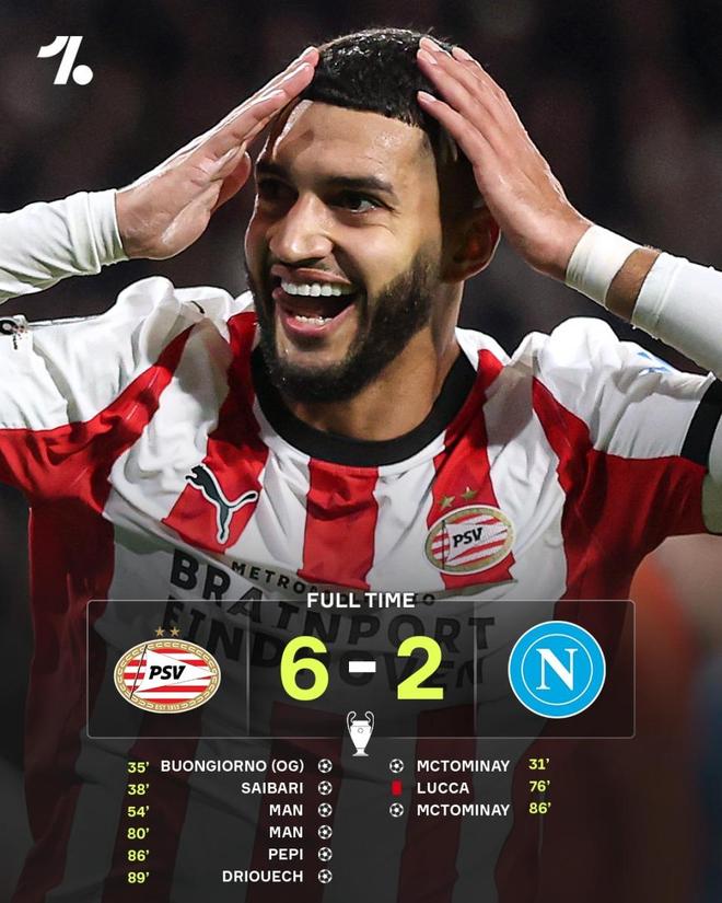 国际米兰4-0比利时冠军圣吉罗斯联合,邓弗里斯、劳塔罗、恰尔汗奥卢和皮奥各入1球;三战全胜、零失球,排在积分榜第二的高位。今夜最大的冷门,来自意甲卫冕冠军那不勒斯。孔蒂的球队客场挑战荷甲劲旅埃因霍温,结果2-6惨败,全场被打得毫无还手之力。这是孔蒂执教生涯首次在正式比赛中被对手单场打进6球,也让那不勒斯的出线形势急转直下。意大利媒体甚至用“灾难之夜”形容这场失利。德甲豪门多特蒙德也凭借4-2击败哥本哈根拿到首胜,重新点燃小组出线希望。