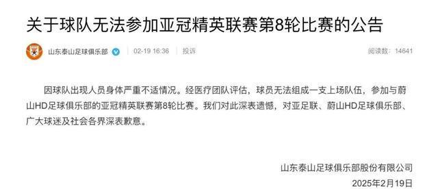 山东泰山因综合原因退赛。